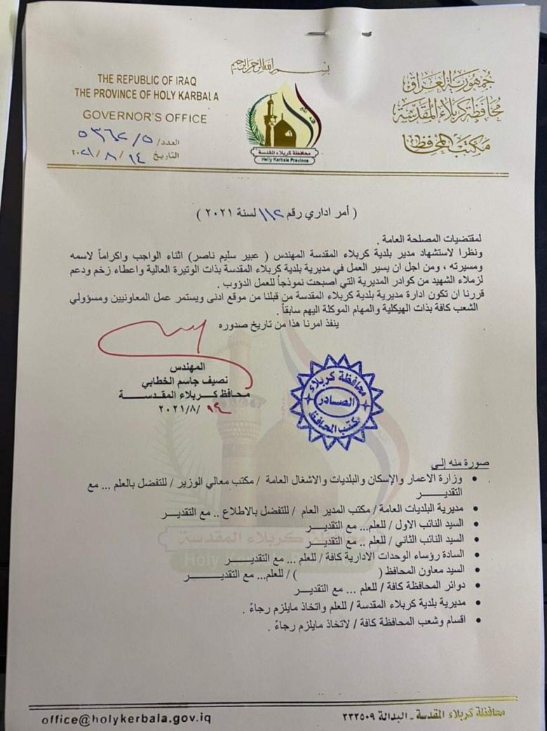 قرر محافظ كربلاء المقدسة المهندس نصيف جاسم الخطابي،خلال اجتماعا هام بعد انتهاء مدة الحداد الرسمي على روح شهيد الواجب المهندس عبير سليم رحمه الله، ان تكون ادارة مديرية بلدية كربلاء من قبله بشكل مباشر وادارتها من موقع ادنى مع الحفاظ على كامل الهيكلية الادارية والفنية في الدائرة، لكون كربلاء المقدسة تحتاج الى عمل كبير خصوصا اثناء الزيارات المليونية والايام الاعتيادية من السنة وان الخطط الخاصة بزيارة العاشر من محرم الحرام بطور التطبيق ولاجل ان يستمر العمل بذات الوتيرة العالية.