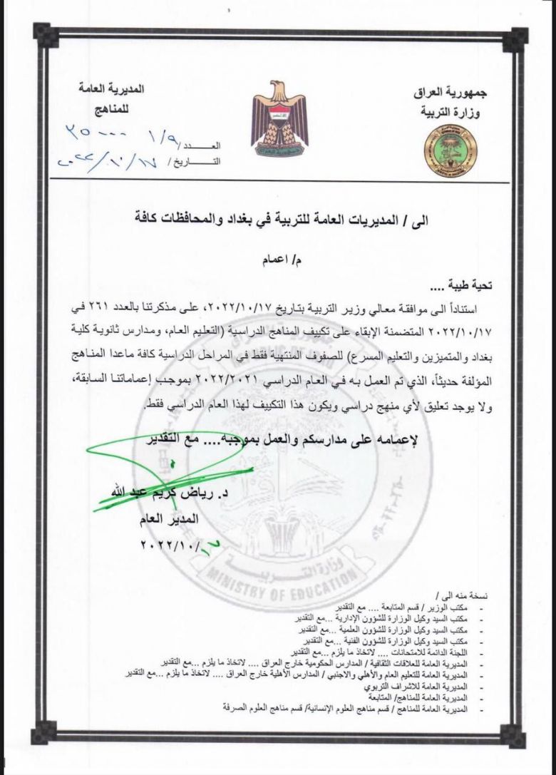 وقالت الوزارة في بيان تلقى موقع كربلاء الاخباري نسخة منه، إن :الوزير علي حميد الدليمي، وافق على تكييف المناهج الدراسية (التعليم العام، مدارس ثانوية كلية بغداد والمتميزين، التعليم المسرع) للصفوف المنتهية فقط (السادس الابتدائي، الثالث المتوسط، السادس الاعدادي".