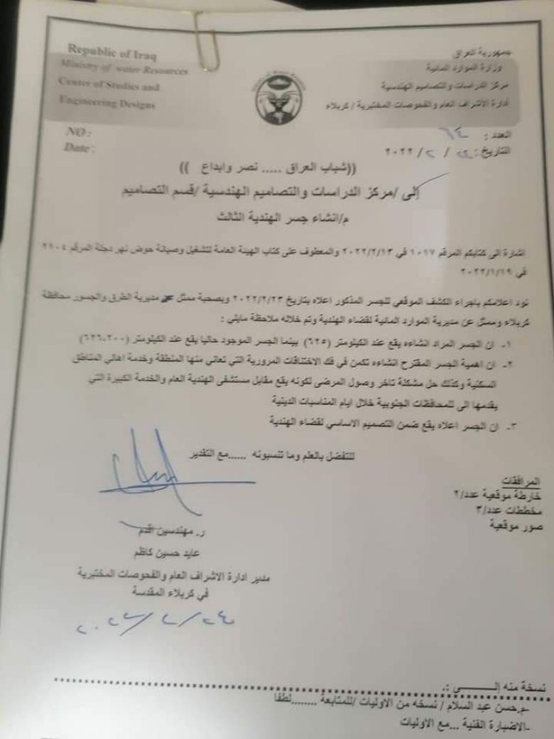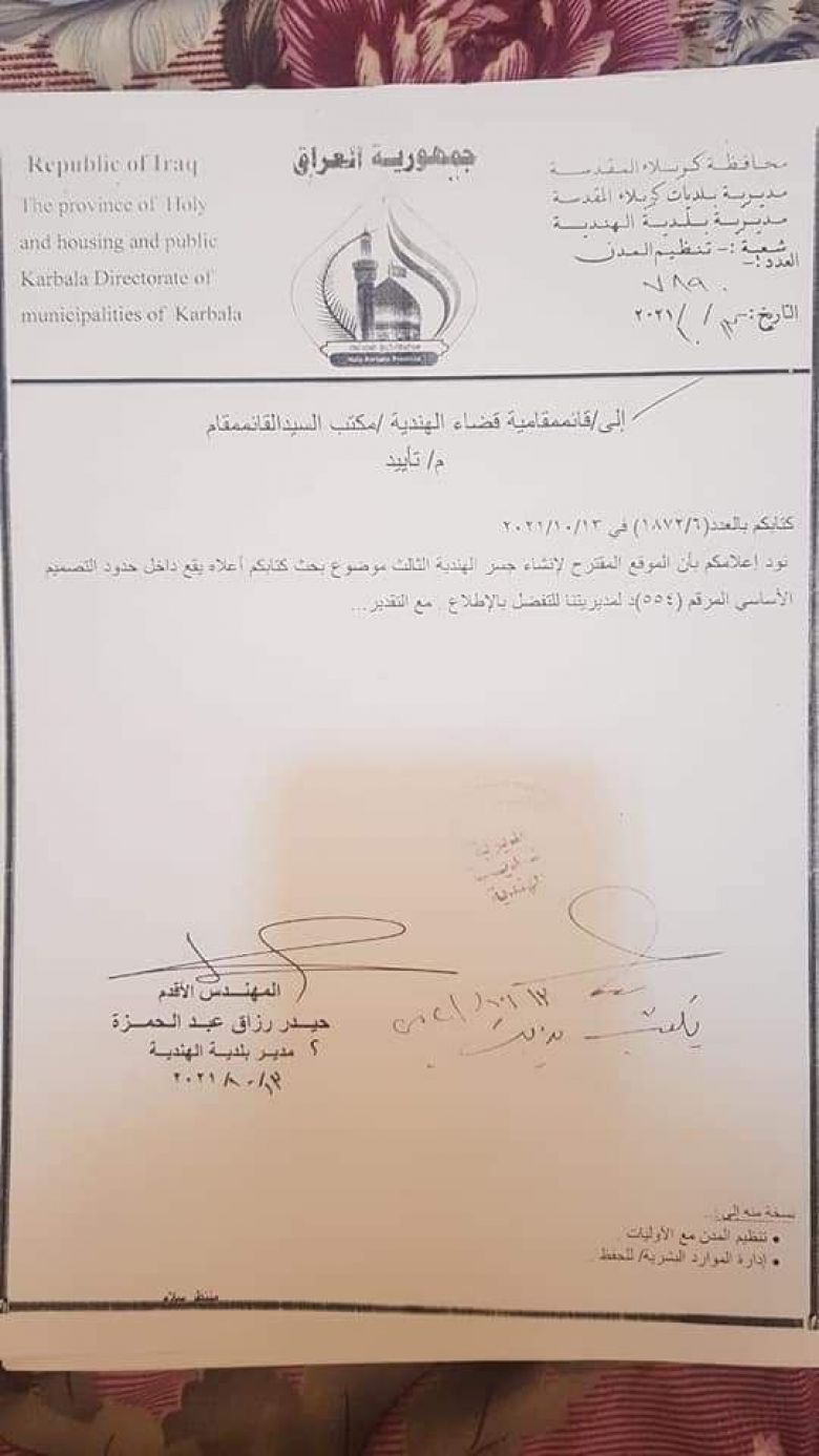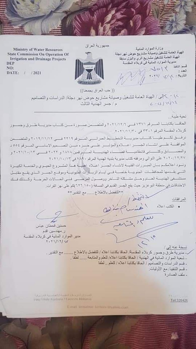 بالوثائق/قائمقام الهندية يؤكد استمرار العمل لانجاز جسر جديد في القضاء