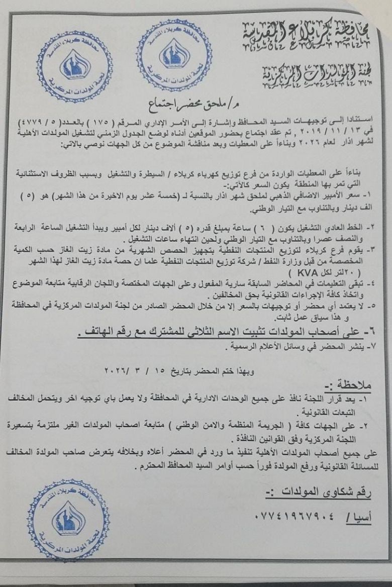 أعلنت لجنة المولدات المركزية في محافظة كربلاء المقدسة، اليوم الاحد، تحديد تسعيرة الأمبير وساعات تشغيل المولدات الأهلية للنصف الأخير من شهر آذار، وذلك بسبب الظروف الاستثنائية التي تشهدها المحافظة وبناءً على توجيهات محافظ كربلاء المقدسة.