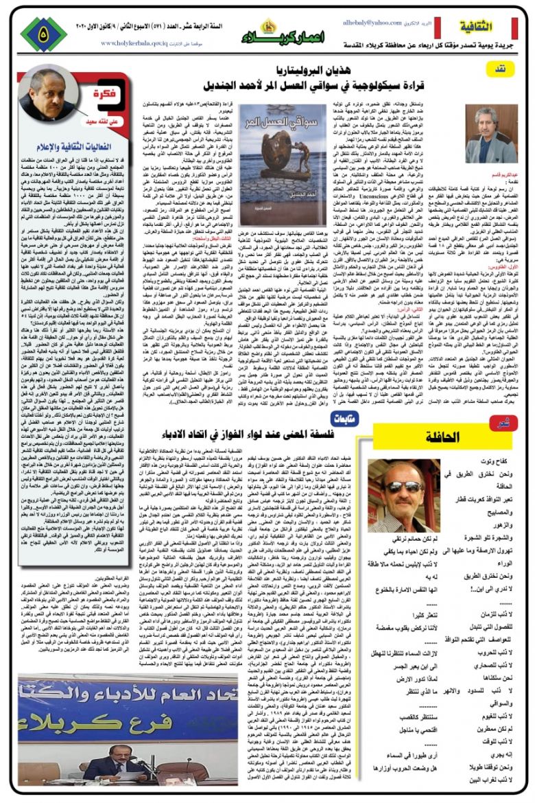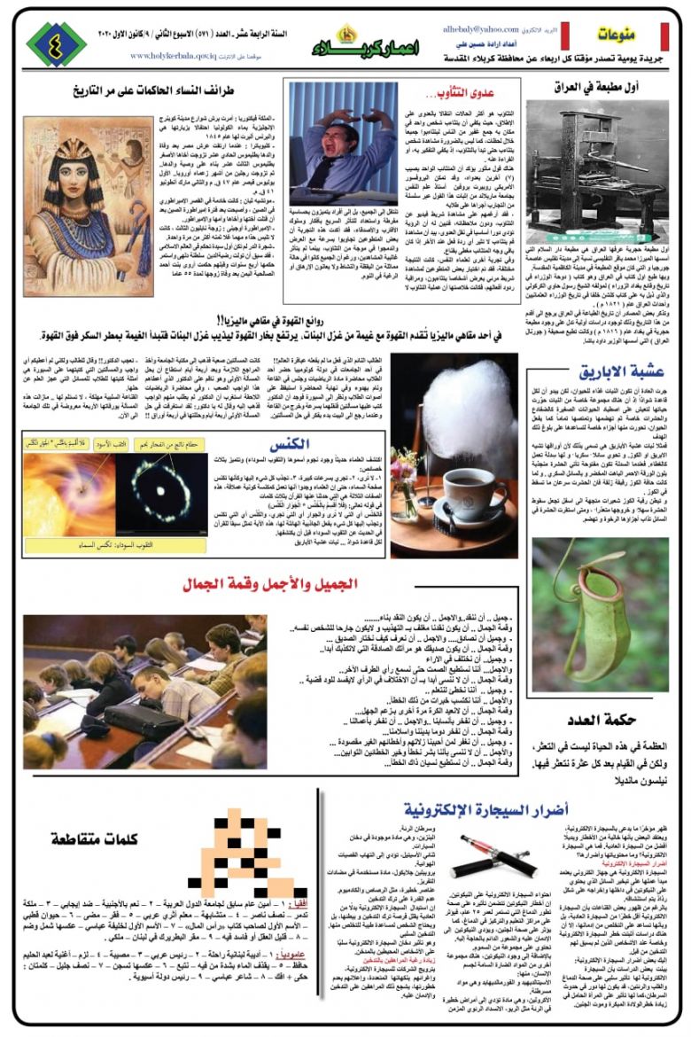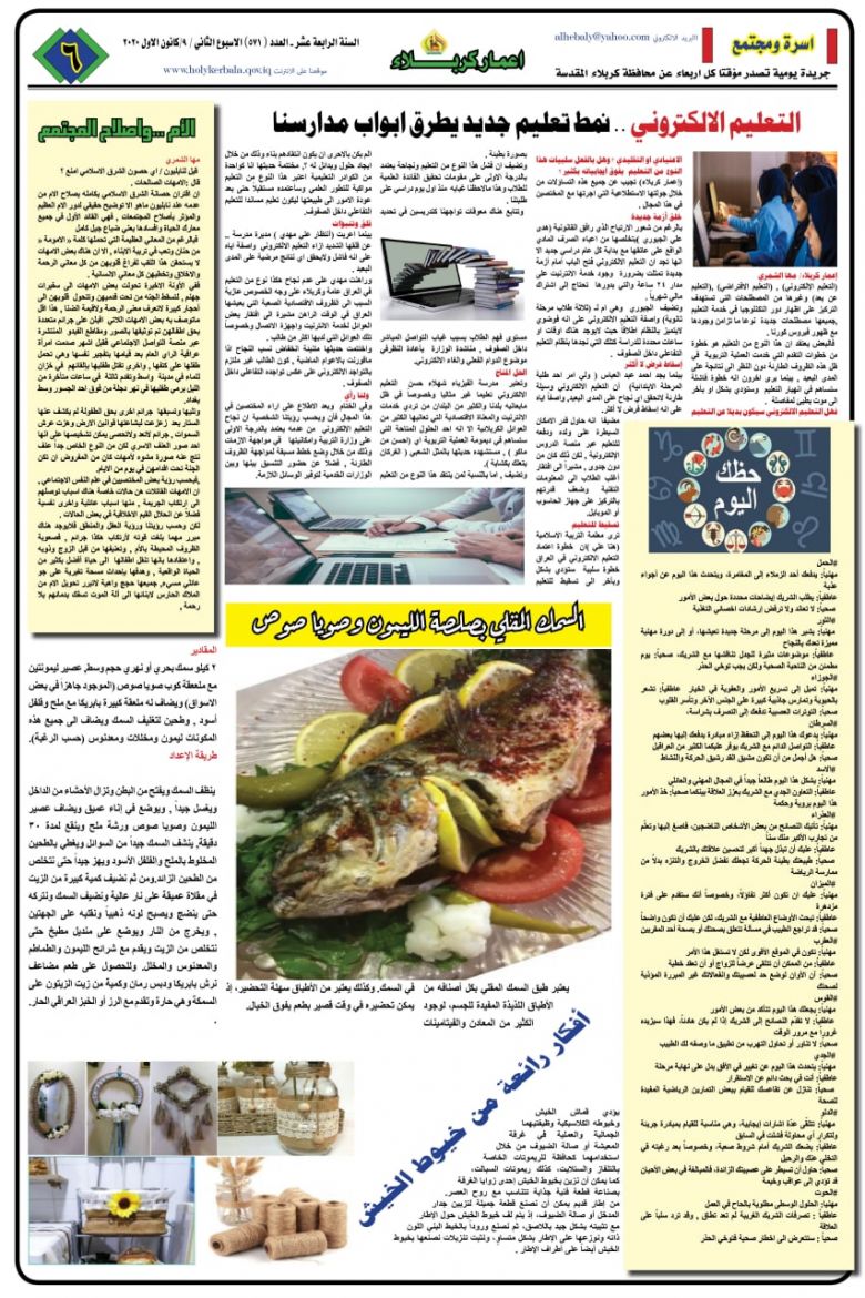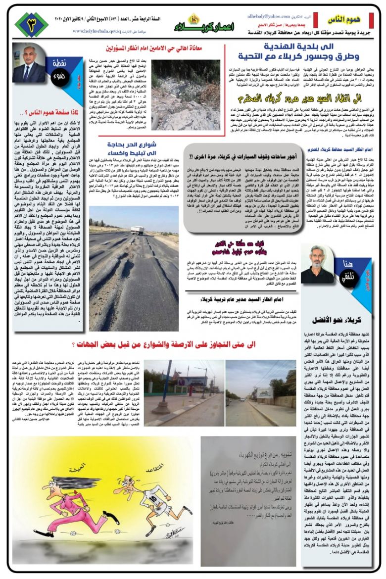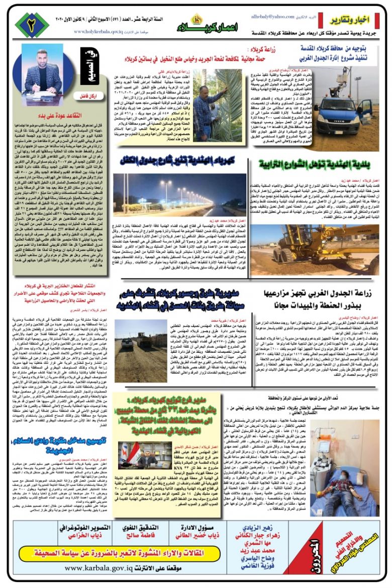 كما ضمت الصفحة الثانية، نشاطات الدوائر في المحافظة والانجازات الذي تم تحقيقها خلال الاسبوع المنصرم، كحملة مديرية زراعة كربلاء لمكافحة لفحة الجريد في بساتين كربلاء ونشاطات مديرية الطرق والجسور في صيانة طريق بنات الحسن في قضاء الهندية.