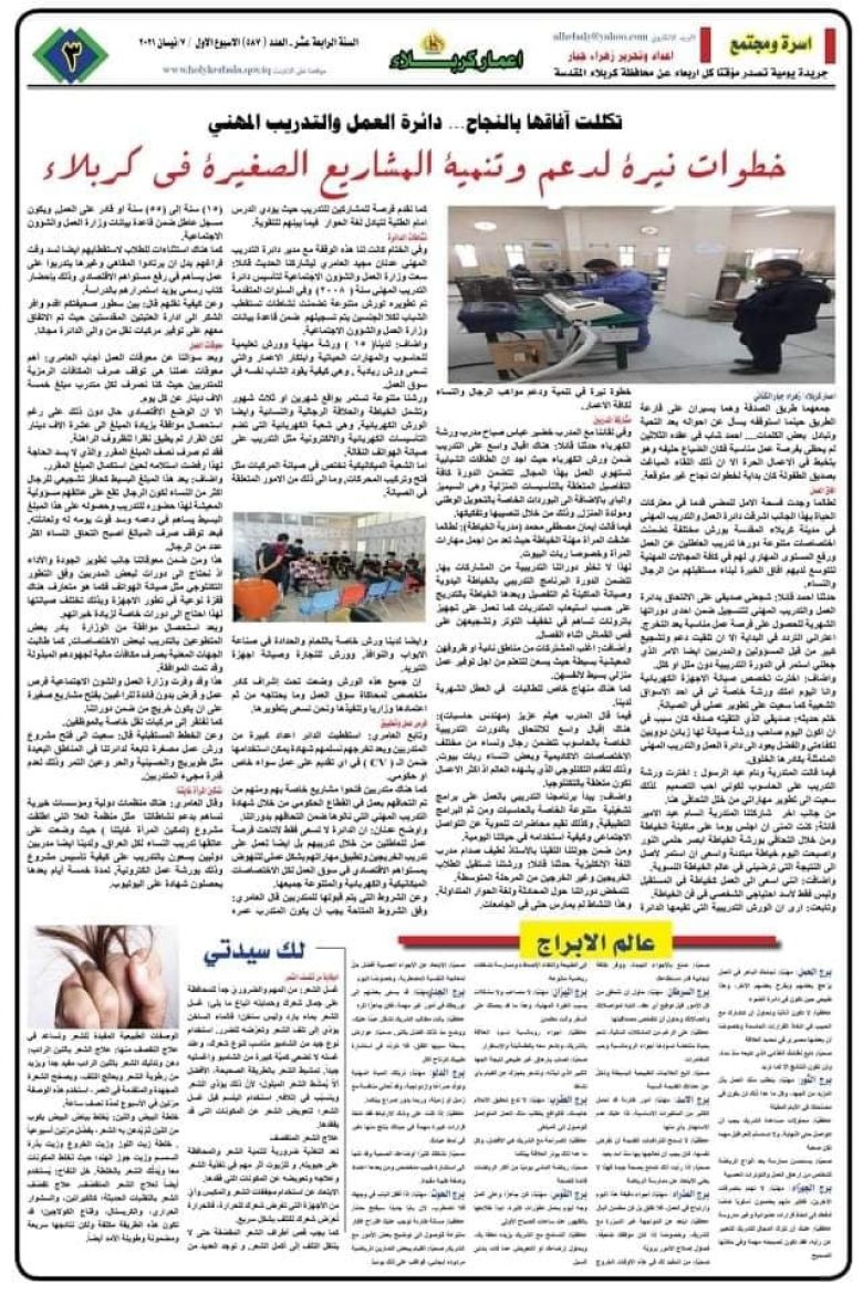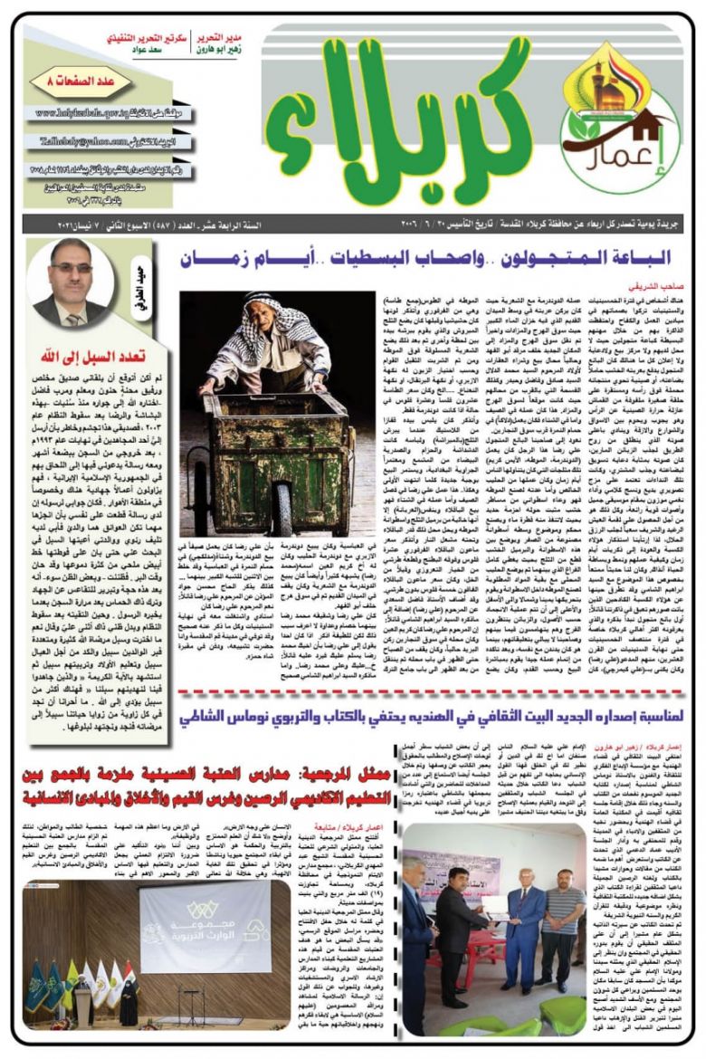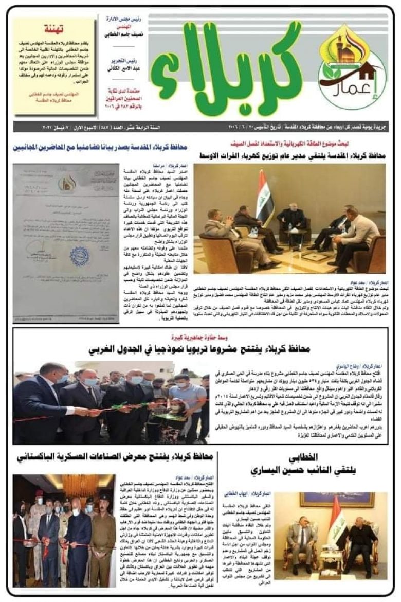 اصدر قسم الاعلام والاتصال الحكومي في محافظة كربلاء المقدسة عدداً جديداً من الصحيفة الرسمية للمحافظة (صحيفة اعمار كربلاء) بنسخة إلكترونية وبمساهمة نخبة من صحفيي المحافظة بنتاج إبداعي مائز.
