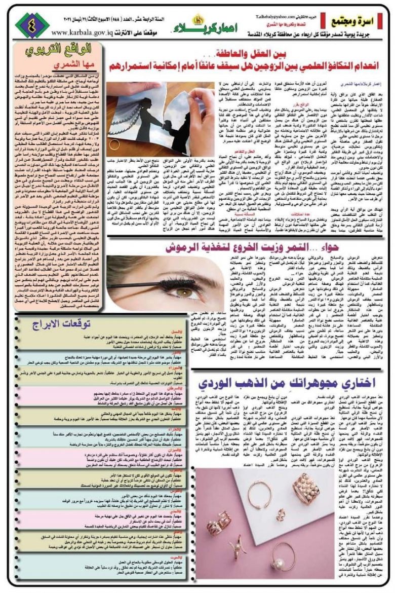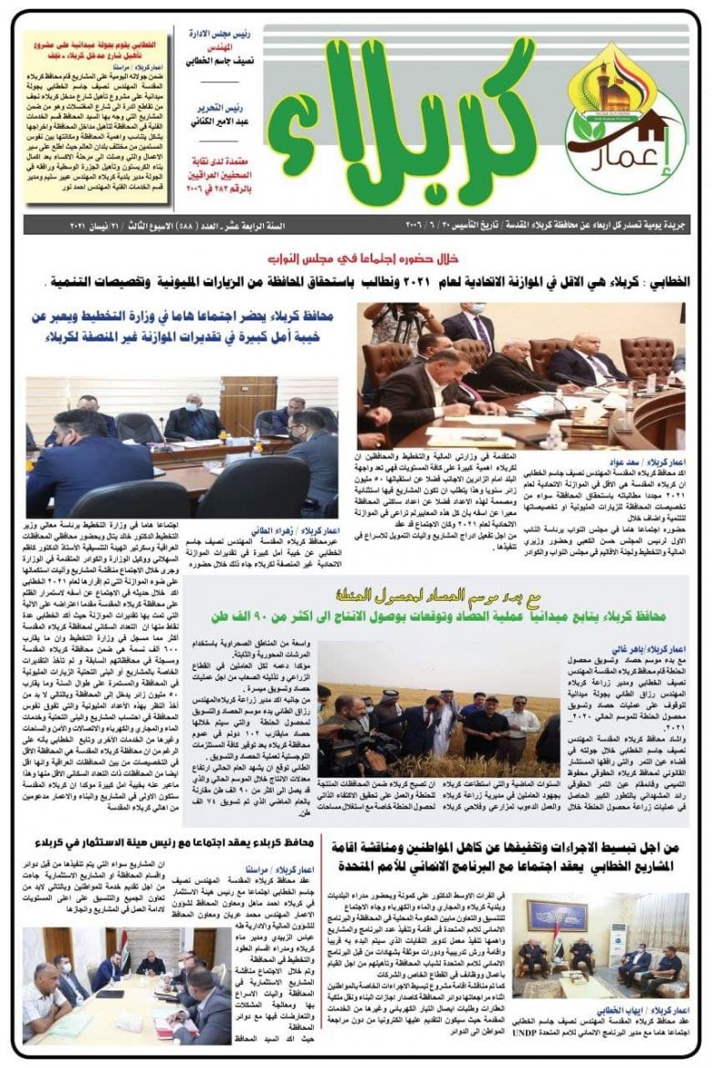 يتكون العدد 588 من صحيفة اعمار كربلاء من ستة صفحات (الرئيسية و اخبار وتقارير و رياضية و ثقافية و الاسرة والمجتمع والخاتمة)،وأن الصحيفة معتمدة لدى نقابة الصحفيين العراقيين بالرقم 332 في 2006 ومستمرة في عامها الرابع عشر.