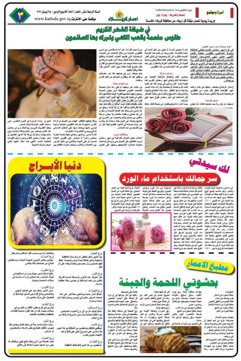 يتكون العدد 589 من صحيفة اعمار كربلاء من أربع صفحات (الرئيسية واسرة ومجتمع اخبار وتقارير والخاتمة)، وأن الصحيفة معتمدة لدى نقابة الصحفيين العراقيين بالرقم 332 في 2006 ومستمرة في عامها الرابع عشر.