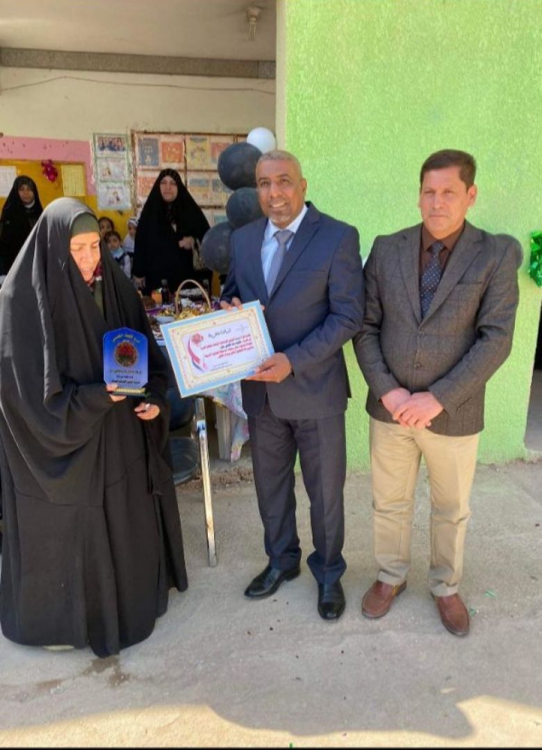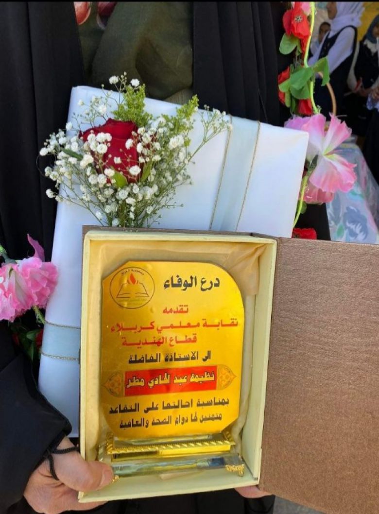 وكرم مدير تربية كربلاء الاستاذ حمزة عبد الحسن عمران، احدى معلمات المدرسة(الست نظيمة) لاحالتها على التقاعد عرفانا لما قدمته من عطاء خلال مسيرتها التربوية.