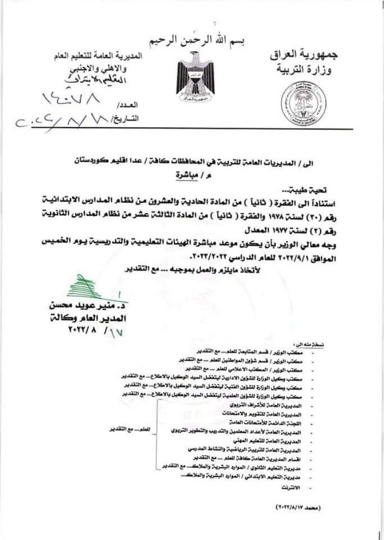 وقالت الوزارة في بيان تلقى موقع كربلاء الاخباري نسخة منه، أن "المديرية العامة للتعليم العام والأهلي والأجنبي وجهت المديريات العامة كافة / عدا اقليم كردستان باعتماد يوم الخميس الموافق الـ1 من أيلول الحالي موعداً لمباشرة الملاكات التعليمية والتدريسية في المدارس".