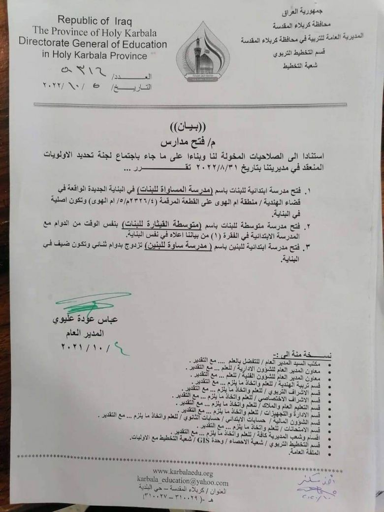 جاء ذلك في وثيقة حصل موقع كربلاء الاخباري على نسخة منها، ان "سيتم فتح مدرسة جديدة في قضاء الهندية مع بدء العام الدراسي الحالي لتخفيف الزخم الحاصل في مدارس القضاء".