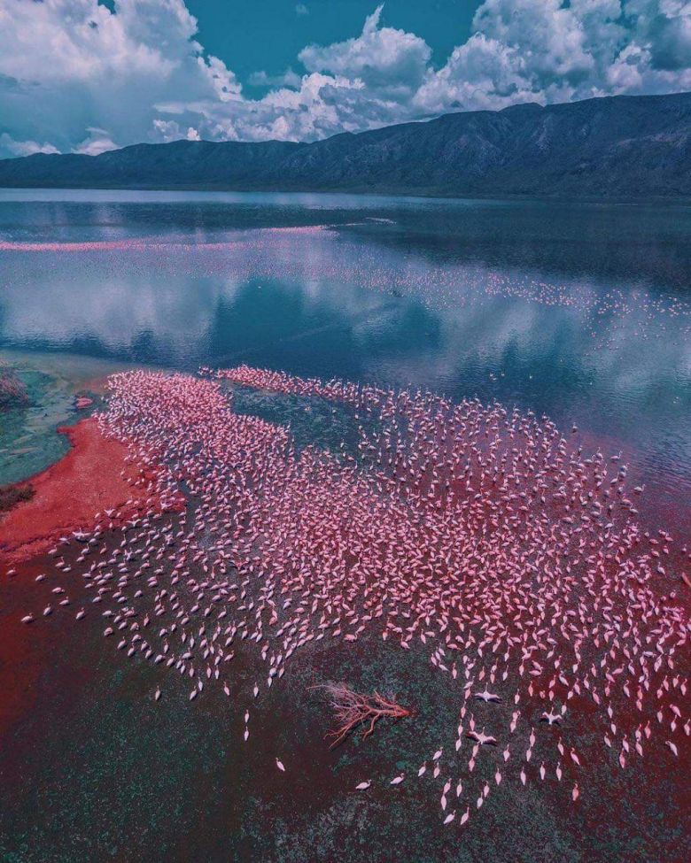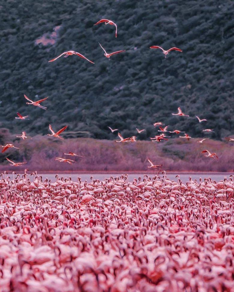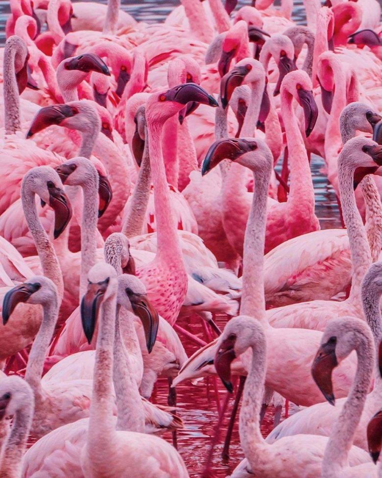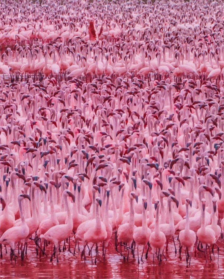 معَ أنّها أصبحت ضمن قائمة الطيور المهدّدة بالإنقراض، إلا أنّ طيور (الفلامنجو) لا تزالُ تؤدّي رقصتها الساحرة برشاقة عالية فوق مياه بحيرة (ناكورو) الشهيرة في كينيا راسمةً لوحة سورليالية في غاية الجمال، وكأنّها عروسٌ يجمّلها الحياءُ والبهجة.