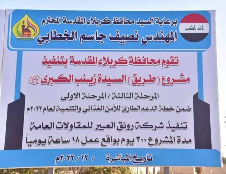 وقال محافظ كربلاء في تصريح لمراسل موقع كربلاء الاخباري، ان "تم وضع الحجر الاساس لمشروع تنفيذ شارع السيدة زينب الكبرى عليها السلام بمرحلته الثالثة ضمن خطة الدعم الطارئ للامن الغذائي والتنمية لعام ٢٠٢٢ بمدة تعاقدية ٣٠٠ يوم بواقع عمل ١٨ ساعة".