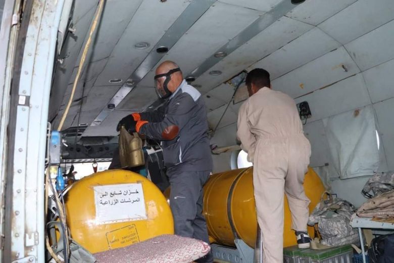 واضاف، ان "الحملة الجوية التي استخدمت فيها طائرتين من طيران الجيش استمرت تسعة ايام وتم خلالها رش ما يزيد على ٢١٨٠٠ دونم من البساتين في الاقضية و َالنواحي وباستخدام مبيد سبارتان EC ".