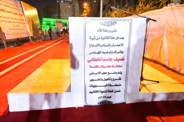 وضع محافظ كربلاء المقدسة المهندس نصيف جاسم الخطابي، اليوم الثلاثاء، الحجر الأساس لمشروع تطوير وتأهيل منطقة البوبيات في مركز المحافظة تلبية لإهالي المنطقة.