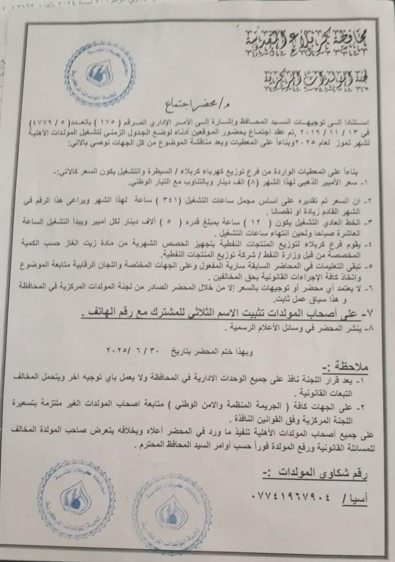 كربلاء تحدد تسعيرة الأمبير وتطلق تعليمات جديدة لتنظيم عمل المولدات الأهلية