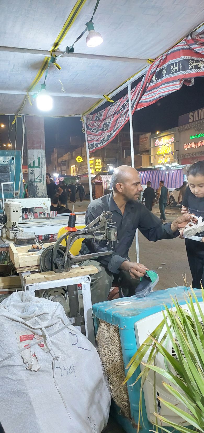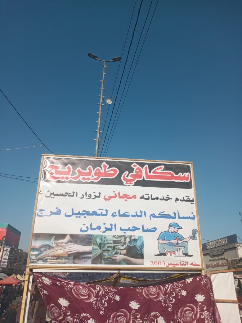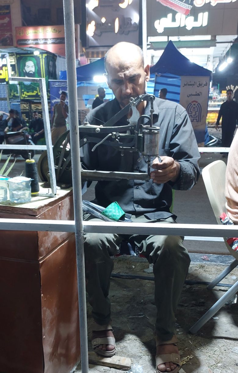 حدثنا الخادم الحسيني باقر خضير عبد وفي نبراته عشق حسيني كبير وامتنان ، يقول كانت بدايتي في عام (٢٠٠٣) حيث عملت في آلة خياطة واحدة لإعمل على اصلاح احذية الزائرين وما ينتعلون واستطعت توفير ما احتاجه من خيوط ومسامير و قطع صغيرة من الجلود، وقدمت خدماتي لمئات الزائرين دون ملل او كلل بالعكس كان في داخلي فرحة عارمة بكوني جزء من منظومة خدمية كبيرة تقدم خدماتها لزائري اربعينية الامام الحسين عليه السلام.