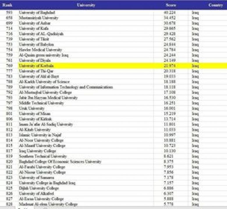 وقال رئيس الجامعة باسم السعيدي، في تصريح ل(موقع كربلاء الإخباري) ، إن "جامعة كربلاء حصلت على التسلسل 11 محليا من اصل 38 جامعة عراقية، و769 عالميا، بحسب التصنيف المذكور".