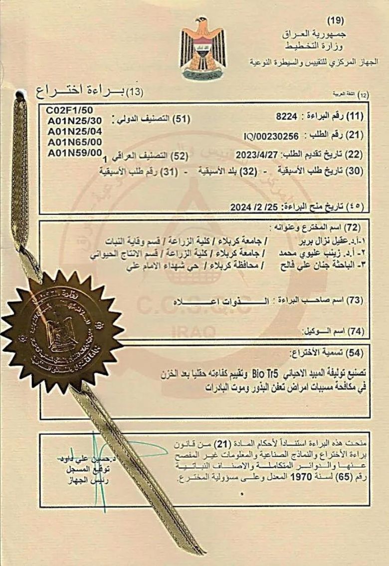 وقالت الدكتورة زينب عليوي التميمي ،في تصريح لموقع كربلاء الاخباري، ان "براءة الاختراع التي تم تسجيلها اليوم حصلت عليها بمشاركة كل من الدكتور عقيل العابدي تدريسي في كلية زراعة كربلاء و الباحثة جنان علي فالح ".